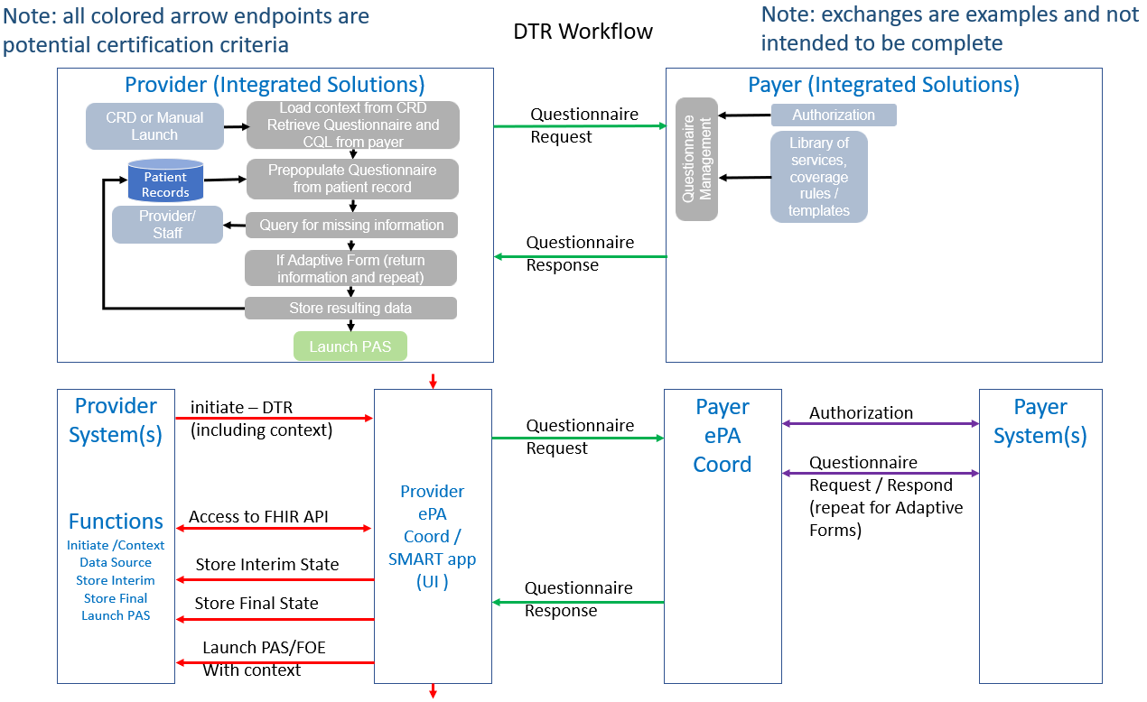 The following drawing demonstrates the DTR Workflow exchanges between an integrated provider HIT environment and an integrated payer HIT environment in the upper portion. The lower portion of the DTR workflow drawing represents the potential for electronic Prior Authorization (ePA) coordinator functionality to play a role between the provider HIT and the payer HIT. It should be noted that the exchanges between the provider HIT (including any ePA) and the payer HIT (including any ePA) will replicate all the defined exchanges between provider and payer (represented by the green and orange arrows). The red and purple arrows are representative of information exchange between the Provider ePA and the Provider systems (red arrows) or the information exchange between the Payer ePA and the Payer systems (purple arrows).