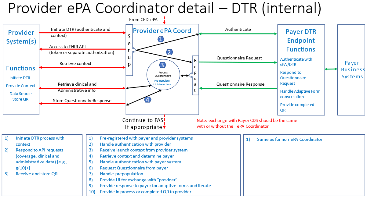 The current versions of the CRD, DTR, PAS, and CDex IGs support for the electronic Prior Authorization (ePA) workflow only focuses on the interactions between the provider Health Information Technology (HIT) in total and the payer HIT in total, not the necessary interactions among the respective HIT solutions that make up the provider and payer HIT environment that will need to participate in the ePA workflow.