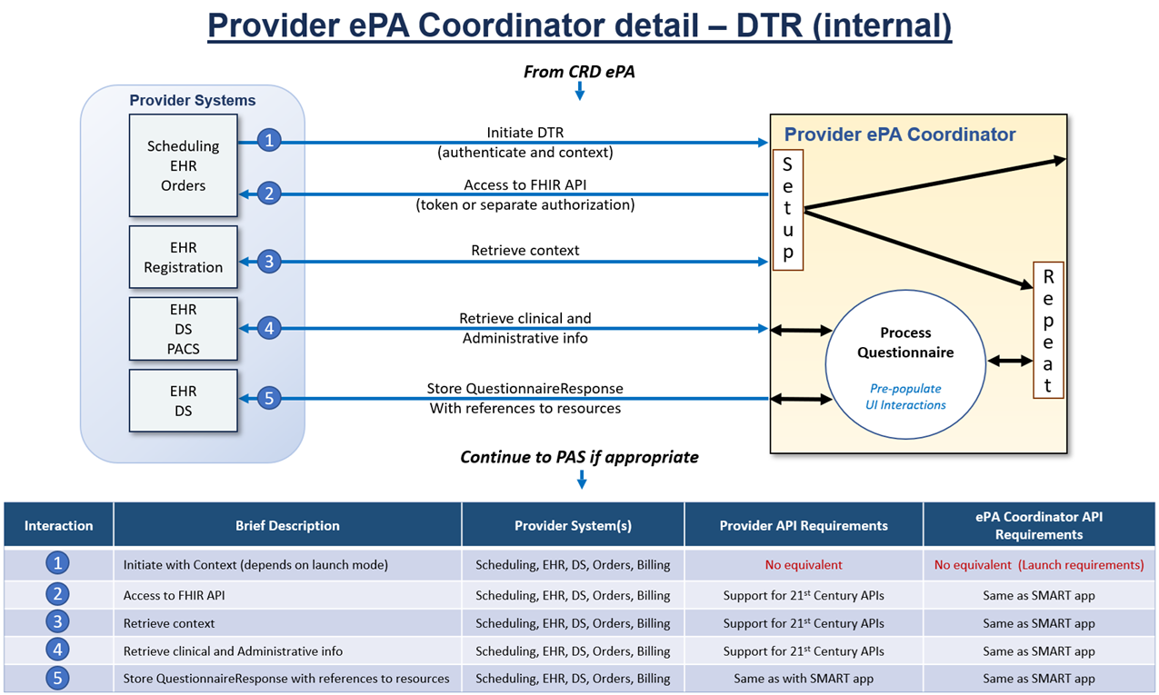 The following graphic and associated table provides an example of the type of interactions that will need to be supported between an ePA coordinator and the various Provider HIT components.