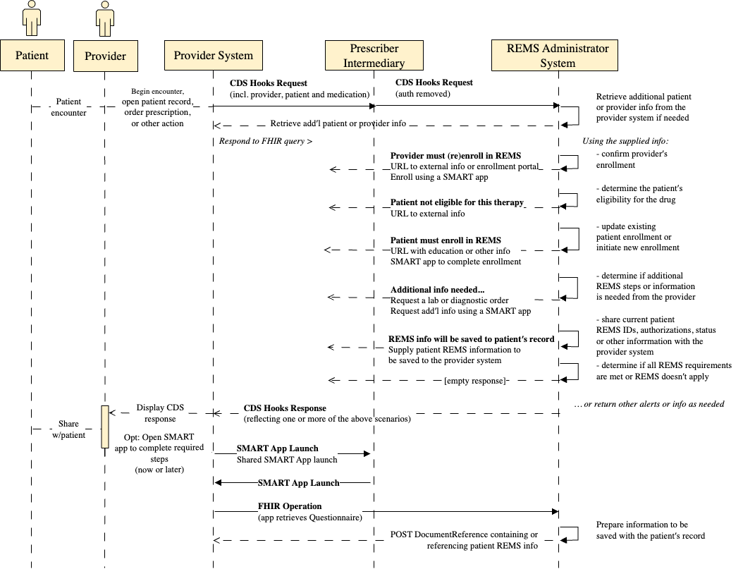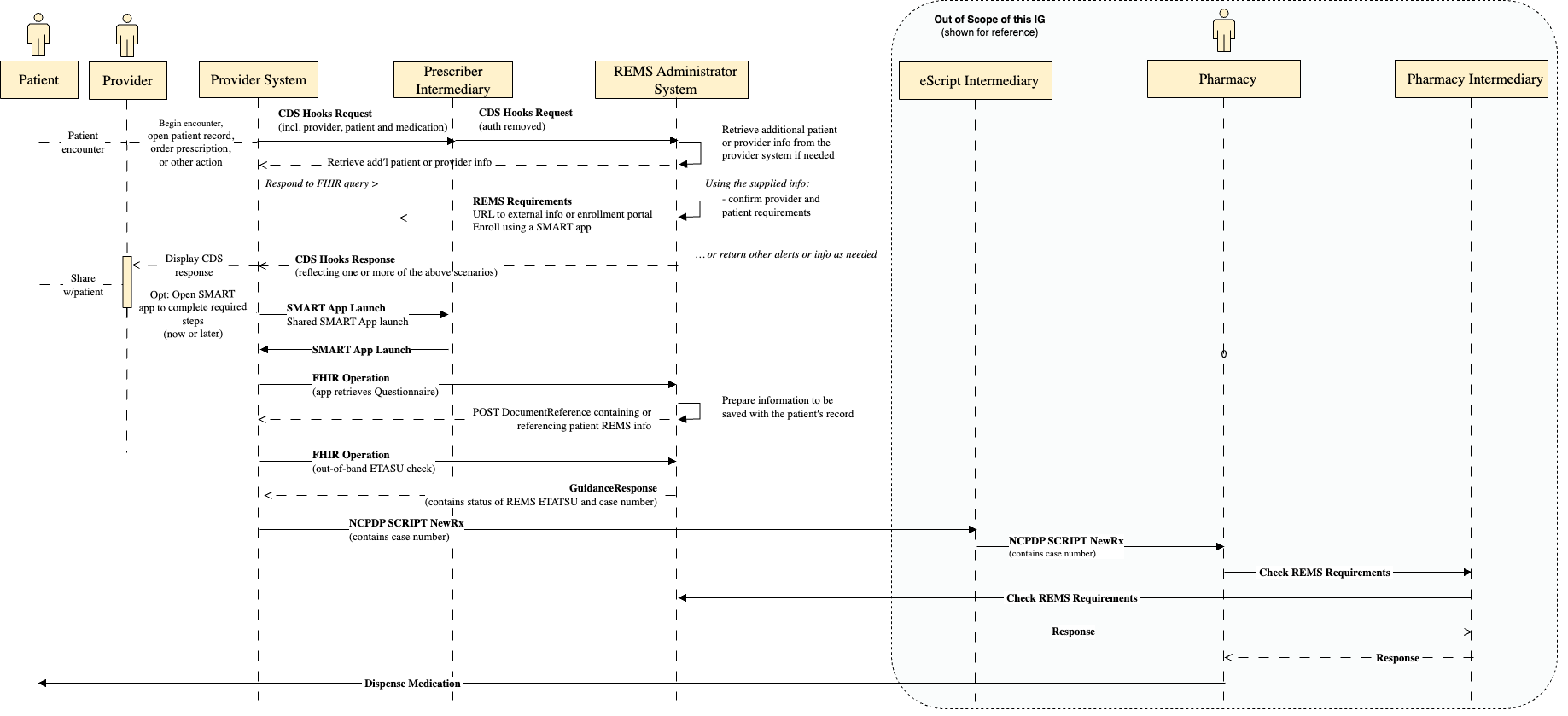 This Implementation Guide is part of a larger system whose scope encompasses not just the Patient and Provider interactions with the REMS Administrator, but also interactions with the Pharmacy. The full system completes the interaction from the initial Provider/Patient interaction to the final Pharmacy/Patient interaction. This starts with the Provider meeting with a Patient and determining that a medication is needed that has a REMS. Through the technologies outlined in this guide they are able to determine what the requirements are for the REMS program and complete those before sending the medication prescription on to the Pharmacy. Once the prescription is sent to a Pharmacy, the REMS interactions are not complete until the medication is dispensed to the patient. In fact, there may even be further interactions with the Provider that check the status of the Patient and determine that the benefits of the Patient using the medication still outweigh the risks.