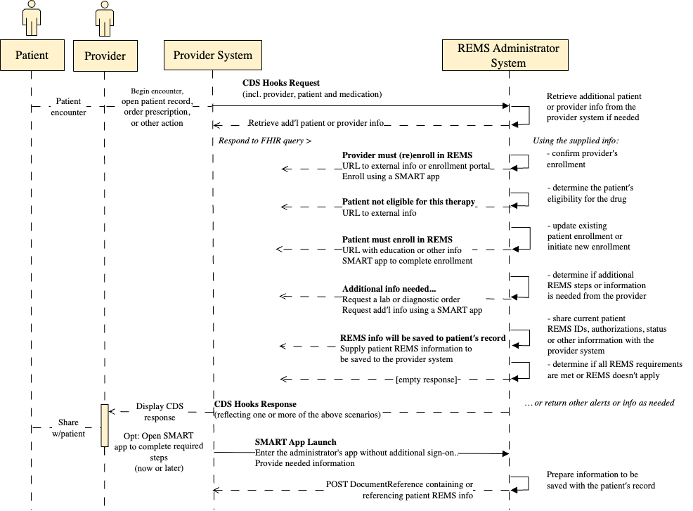 A provider may also take the opportunity to complete a REMS requirement returned in a CDS Hooks response immediately through use of a SMART app. Use of the guide’s patterns can minimize the time needed from the provider in such a circumstance–to complete a patient enrollment form, for example–by the REMS Administrator prefilling or hiding questions that were satisfied by data provided in the preceding CDS Hooks interaction.