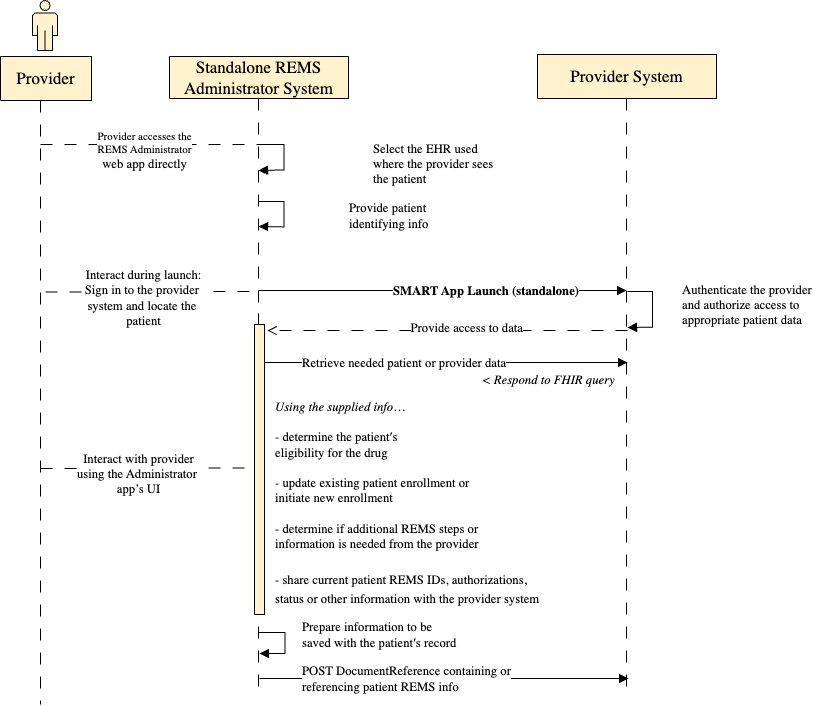 In this interaction, a provider uses an external REMS Administrator application that accesses patient data in a Provider System using standalone SMART app launch.