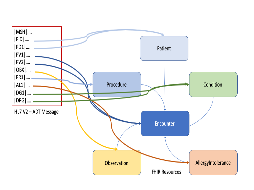 Health Plans receive data from many other sources that contribute to a Member’s Health History. In addition to medical claims Health Plans may receive C-CDA documents or HL7 V2 messages, such as Admit, Discharge, Transfer (ADT) Messages. As an example, the diagram below shows how an ADT Message can be transformed into HL7 FHIR Resources: