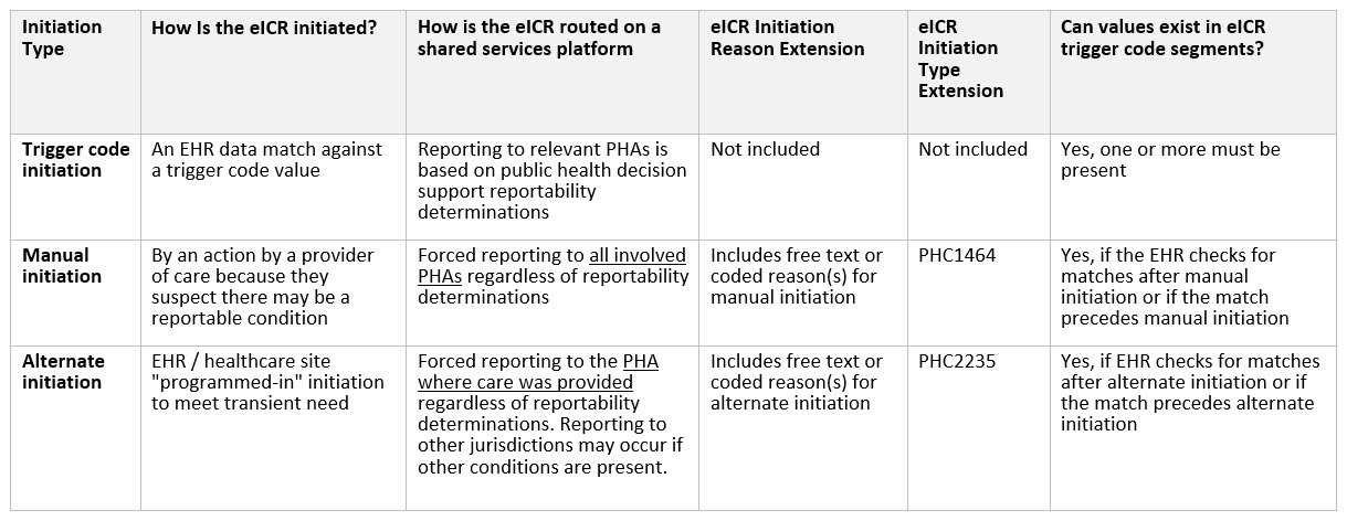 There are some circumstances, however, where they may be manually initiated by providers of care because they suspect there may be a reportable condition. They also may be alternately initiated by automated, forced reporting by the EHR to meet short term reporting needs. The following matrix illustrates these different types of initiation: