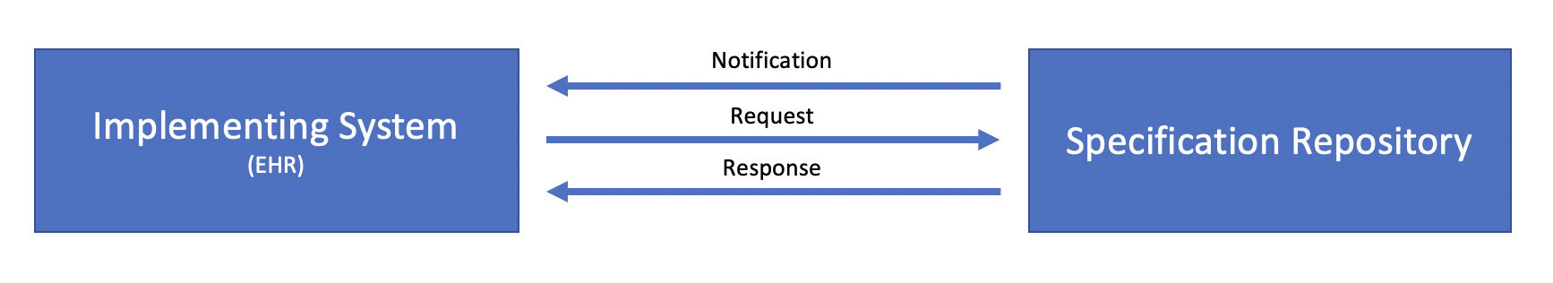 The distribution of case reporting specifications involves two systems, the Implementing System (typically an Electronic Health Record (EHR)) and the Specification Repository, a repository that manages reporting specifications and the versions of those specifications over time: