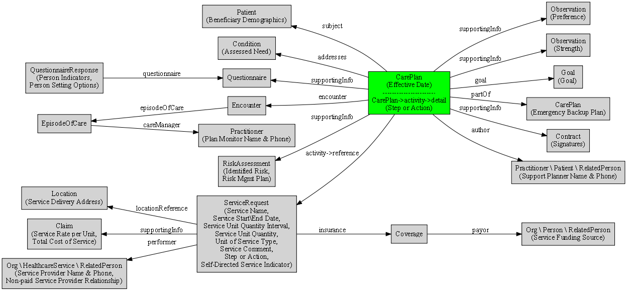 The concept of an eLTSS service plan most closely aligns with the FHIR CarePlan resource, which is semantically a good fit. The diagram below shows the FHIR resources utilized in the mapping as well as the FHIR data elements used to link these resources. Parentheses indicates the eLTSS Dataset data element (e.g. Assessed Need, Preference) or group of elements (e.g. Beneficiary Demographics, Person Indicators). Lines indicate linkages between FHIR resources and are labeled with the FHIR data element that provides the reference.