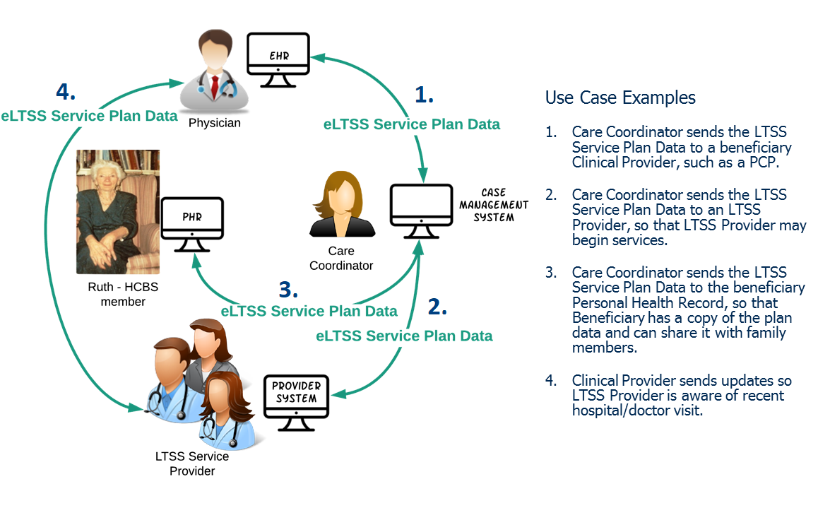 Once an eLTSS plan is created using FHIR, there are 4 sample use cases that highlight the possible exchanges that an eLTSS Plan may be involved in (user story 2 above). The figure below illustrates these use cases.