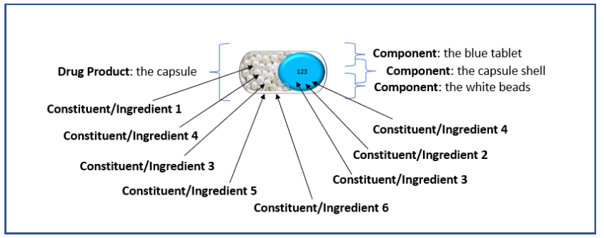Component content includes information such as: a component identifier, component type, and release profile of the component and the amount of each constituent (both active and inactive ingredients) contained in the component as well as the function of the constituent in the component.