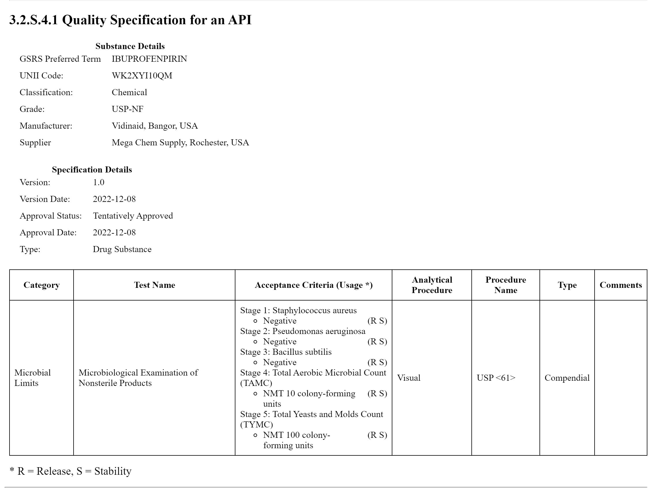 Additionally, there is an example specification to show the reference to a Drug Substance 6004e36e-7df9-469d-9b29-8e9f9bd7e95f. Its narrative layout is show below the Drug Product specification.