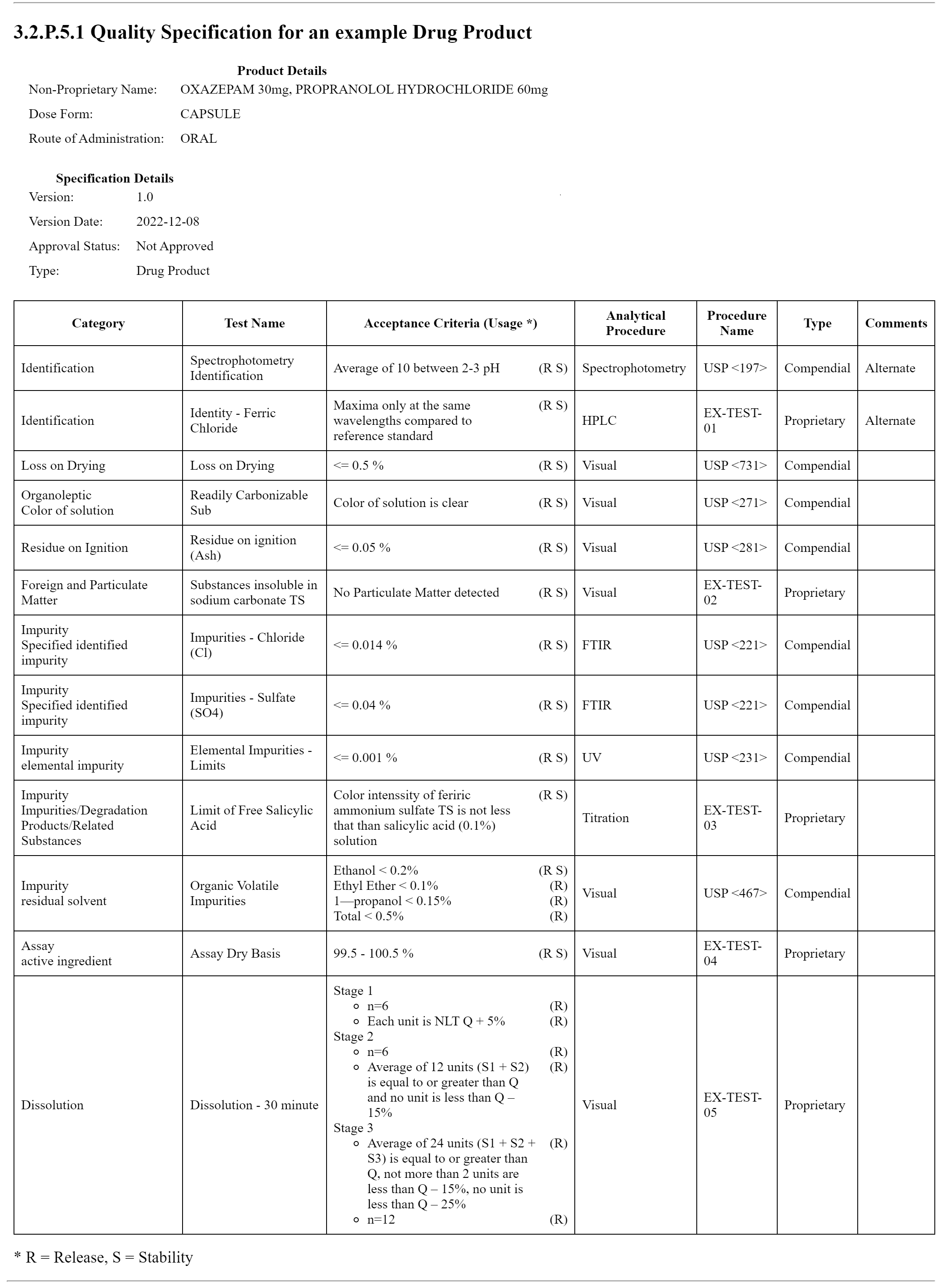 This example demonstrates a quality specification for a Drug Product. The first image displays the XML for 3.2.P.5.1 as it appears in a browser with the narrative inserted in the composition text element. The XML can be found on the Artifacts page. The XML file with the publisher narrative is on the artifacts page and in the Bundle profile. 4a7e17c1-a611-4cc7-9a71-8005a8b427ab