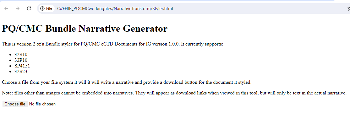 The div element within the narrative is limited to XHTML content. This is a restricted set of formatting directions. A narrative transform has been developed that formats valid XML files for each of the Bundle profiles. The narrative transform can be downloaded on the Downloads page. Its use is not required, however any other means of creating the narrative must display all content for each bundle that this transform supports. If the data is displayed in a table, and an alternative representation is used, an alternative narrative must present those elements in a table. The narrative transform is an HTML page with javaSripts. It reads the file, displays its process and previews the inserted human readable XHTML. After review, a user can save the file. It only saves to the download directory. The examples of the Bundle resources are displayed with their respective styles. The downloadable examples and those accessible from the Artifacts page have the IG default build style applied. Any content in the any div.text element is cleared and replaced by the narrative transform. Saved XML files may be opened in any browser to view the content; however Firefox and Chrome are suggested.