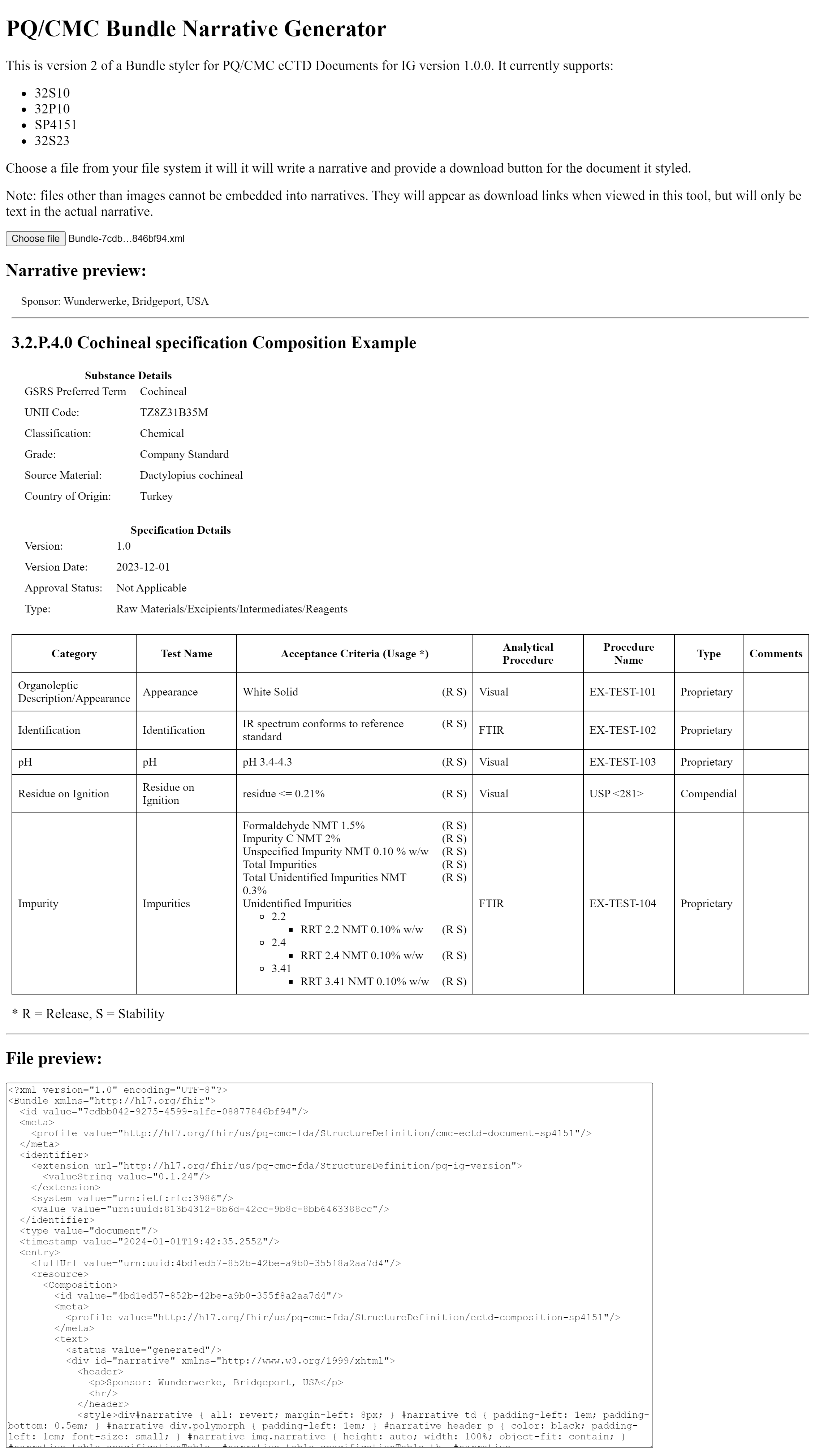 Human readable representation or visualization of the content of the PQ/CMC Bundles is required. The location for this in the narrative element of the text element for the domainResource of the Composition which is required for document type Bundle resources. Some PQ/CMC bundles involve complex data and relies on many resources to convey meaningful content. Because the Composition resource provides the context for all the other resources in the Bundle it is preferred to enter all the human readable content in the Narrative of Composition. The Composition Narrative will embody the whole (including the Resources in the Bundle it refers to), so that it represents the full document. All other resources shall have the status value=”empty”.