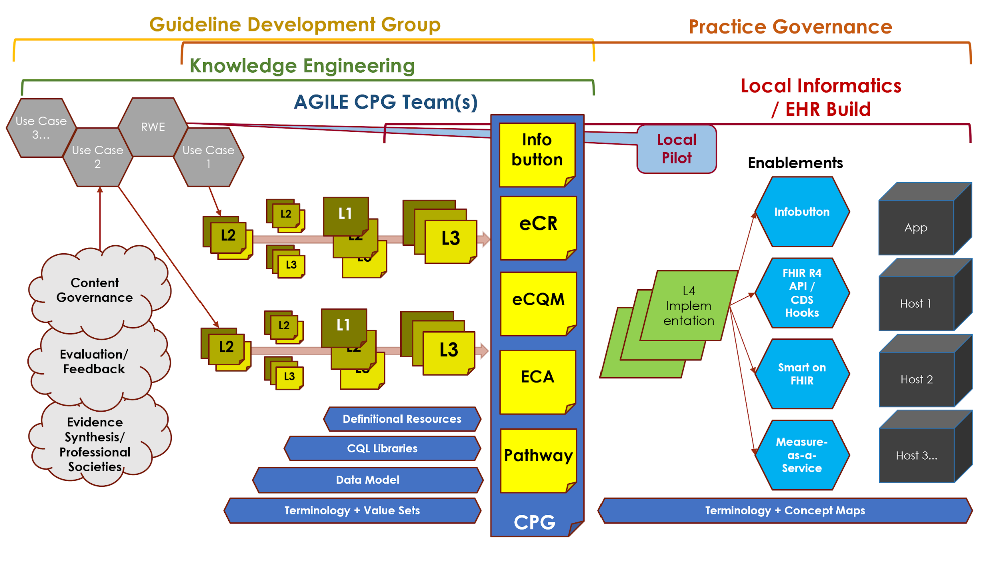 Members of the content team, which included f \rontline clinicians, clinical informaticians, and representatives from medical specialty professional societies and evidence-based practice centers (EPCs) provided content in the form of high-level use cases and detailed clinical domain knowledge. The knowledge engineering team worked with the content team to review and prioritize the content. Next, an integrated, cross-functional Agile CPG Team was formed for each use case consisting of members from each of the functional teams. The work was performed using the Integrated Process and Agile Approach to CPG Development resulting in L1-L4 artifacts as shown in Figure MSC.01, as outlined in this implementation guide,.