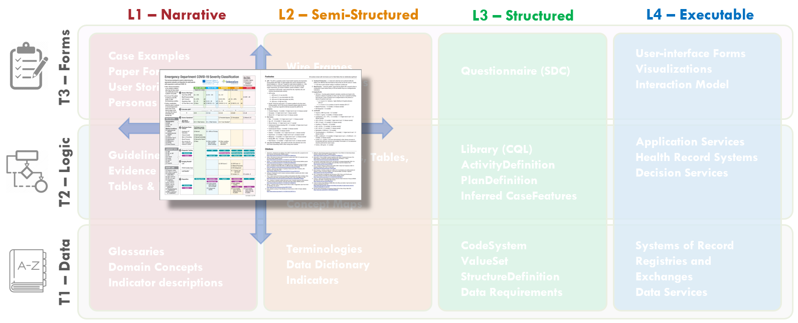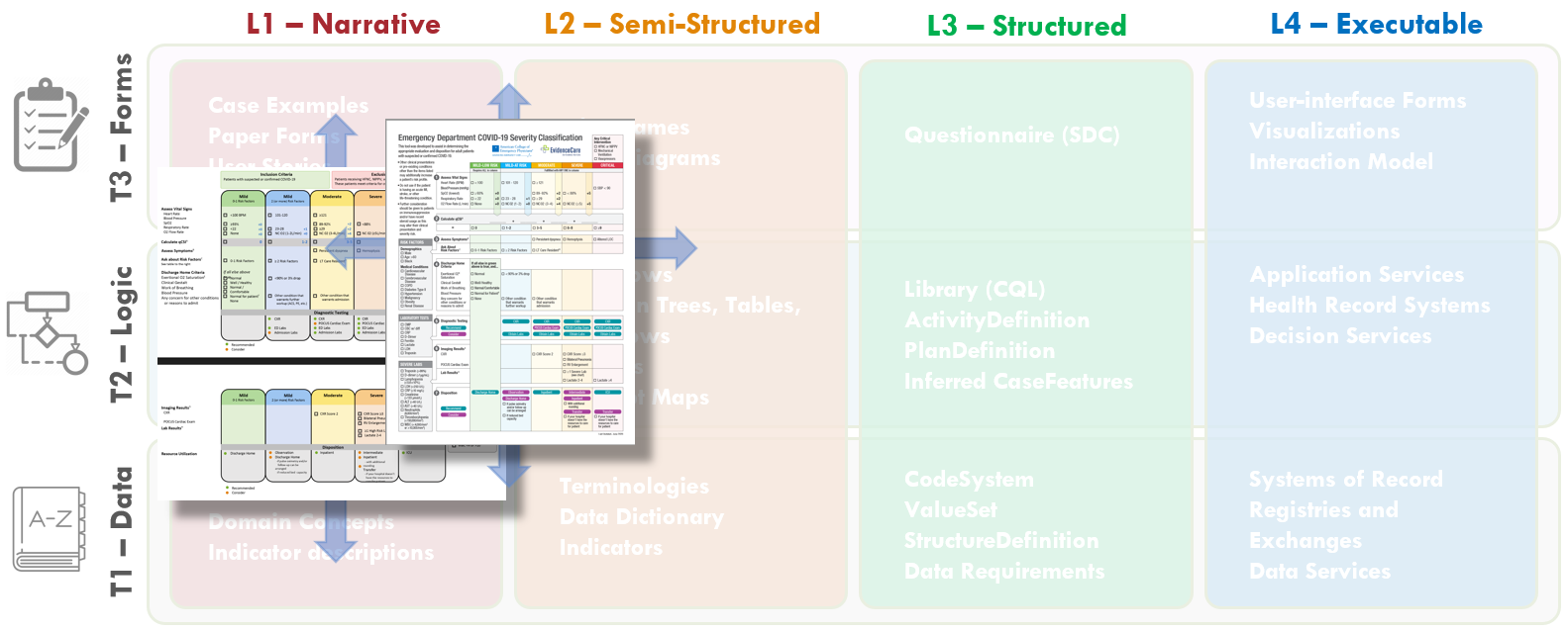 FIG MSC.36. The various CPG artifacts (e.g. Pathway, Strategies, Recommendations, CaseFeatures, Metrics) are sharable, faithful, computable expressions of the clinical practice guideline for ACEP’s COVID-19 ED Severity Classification and Disposition Recommendation guidance. As such, these artifacts are squarely situated in Level 3 and across all three Tiers.When the different components of the CPG are not authored using FHIR languages in the first place, the translation of the models into FHIR is not determined by the choice of source language, but rather by the nature of the knowledge content.
