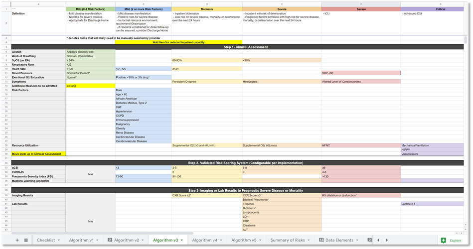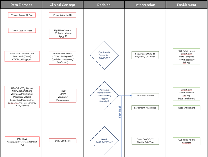 During 2020, a coalition of nearly fifty private sector organizations, including healthcare delivery organizations (e.g. hospital systems) formed to advance the rapid development and dissemination of computable clinical best practice guidance for COVID-19. The coalition tackled the need for classifying COVID-19 patients presenting in emergency room settings to inform recommendations for triaging patients to differing levels of care and settings.
