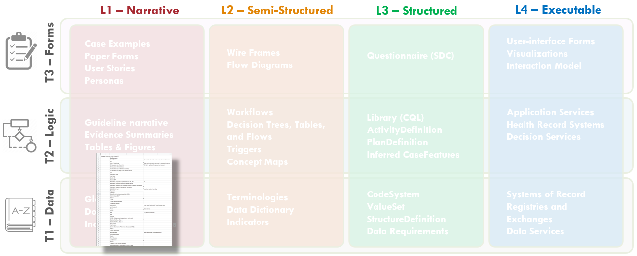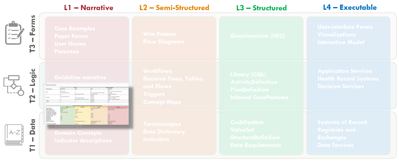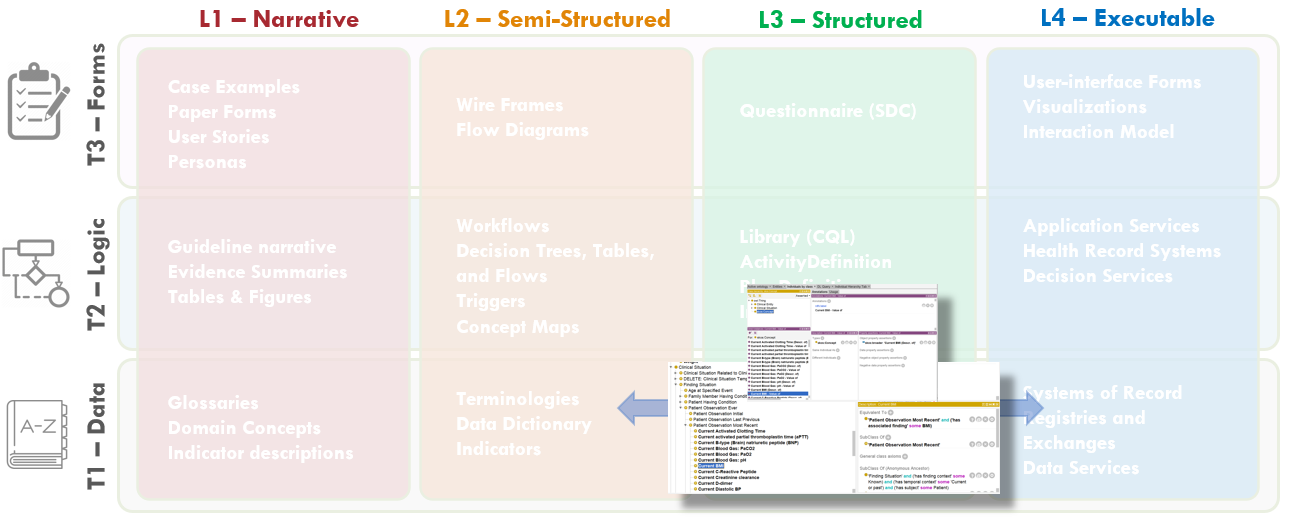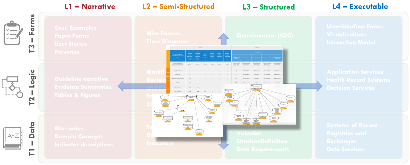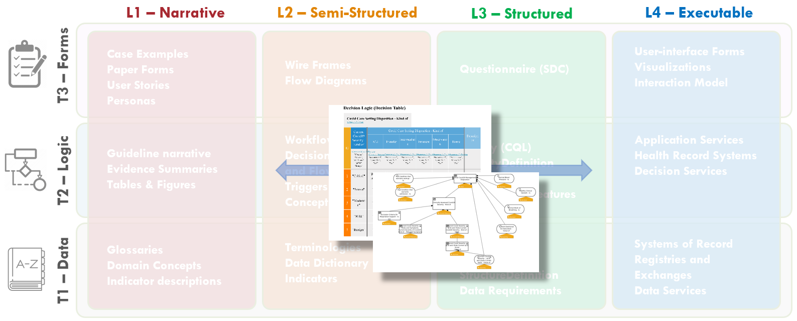 FIG MSC.20. Computable representations of decision logic (Decision Graphs and Tables in DMN) were developed by the technical Knowledge Engineers based on the various Level 2 artifacts developed to date (Structured Recommendation Template, the Decision Flow Diagram, and the Data Definitions) as well as direct interactions with the Content SMEs. These decision graphs and tables span Levels 2 and 3 representations as well as the Logic and Data Tiers. They explicitly represent the clinical concepts and logic in computer-interpretable forms, but are reviewable with Content SMEs.