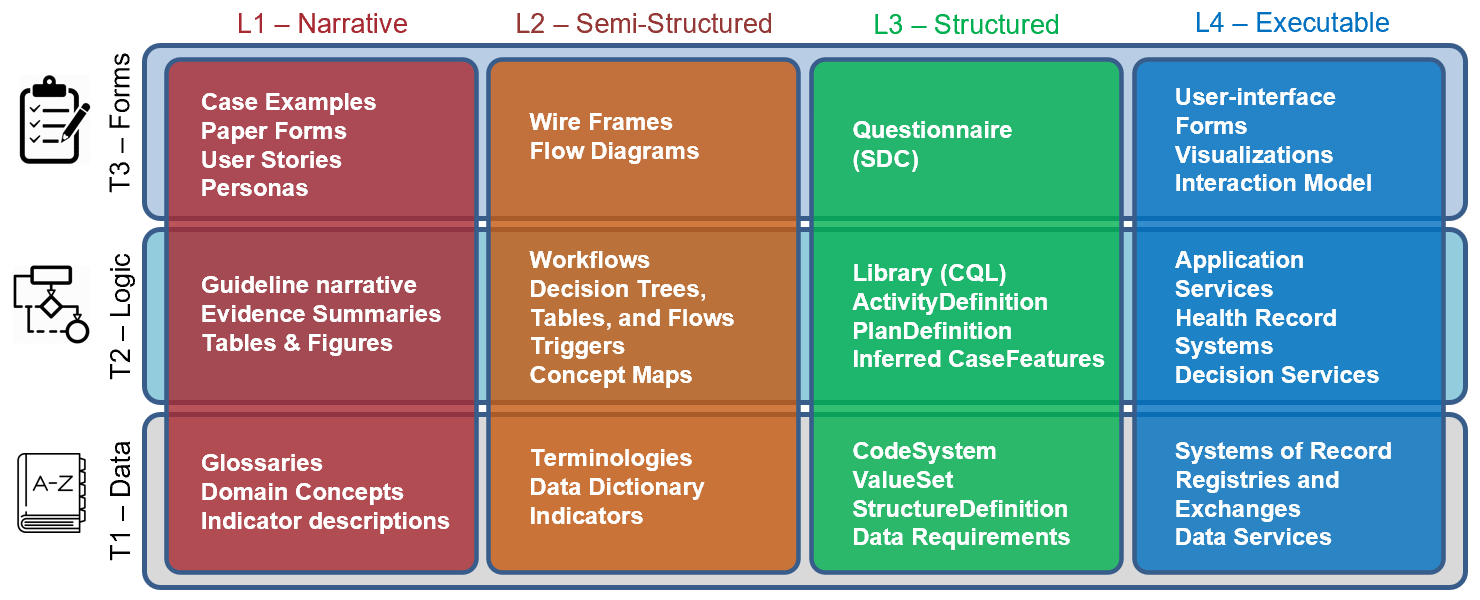 Note: while more explicit narrative descriptions of decision and orchestration logic is captured in this document, much of the formal decision and orchestration logic to be expressed in various computable language libraries (e.g. CQL) used in or by the CPG Profiles is more formally and explicitly defined, refined, and verified in additional activities described below (e.g. Decision Flow Diagram, Decision Tables and Decision Requirements Diagrams [DMN], Pathway and Strategy Logic/ Orchestration Models [CMMN]). Some of these activities cross or combine what might be considered Level 2 and Level 3 representations through the use of fit-for-purpose authoring tools that express computer-interpretable logic using visual analogs. Such tooling is invaluable for establishing a shared understanding and more so “reasoning intent” between domain experts and computable logic expressions.
