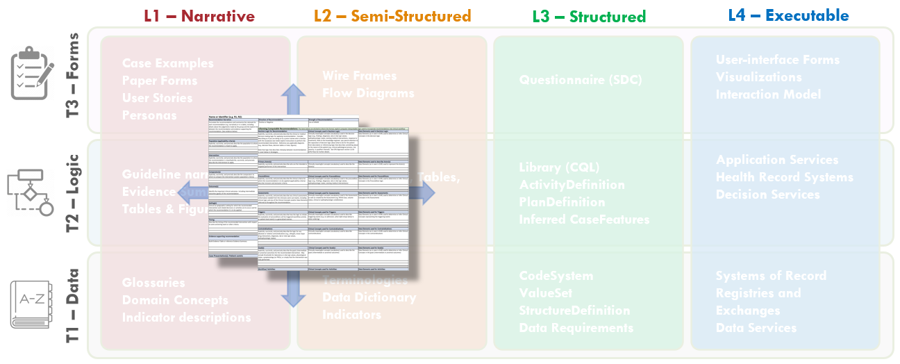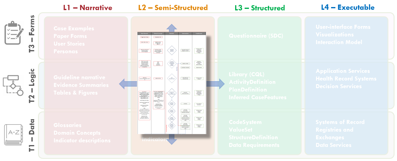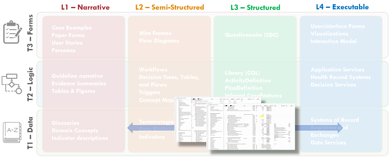 FIG MSC.05. Work products and artifacts produced during execution of the CPG methodology will be mapped to the Levels by TiersTable to illustrate where they are situated in the Knowledge Translation spectrum as well as where they serve to span this translation.
