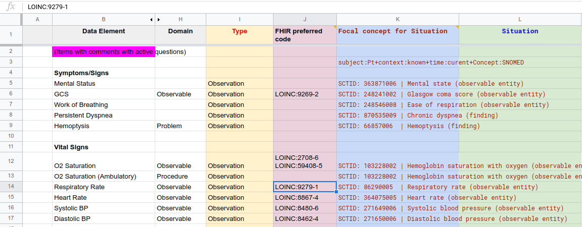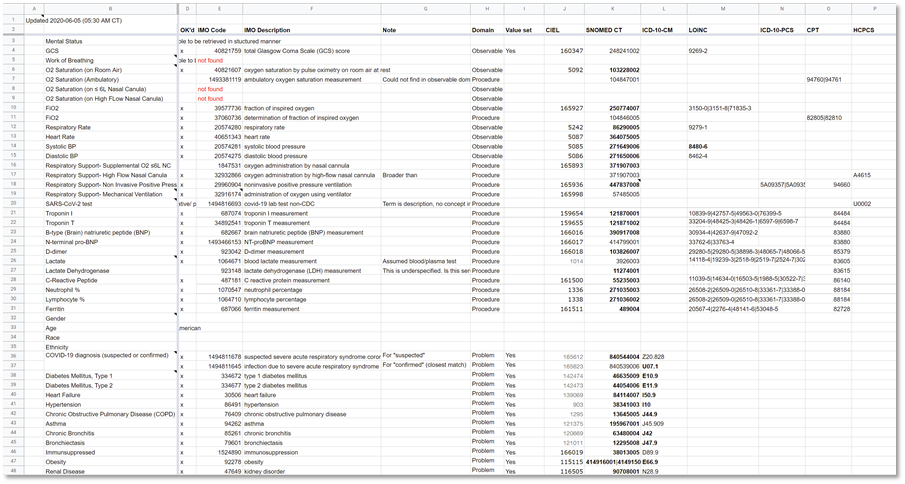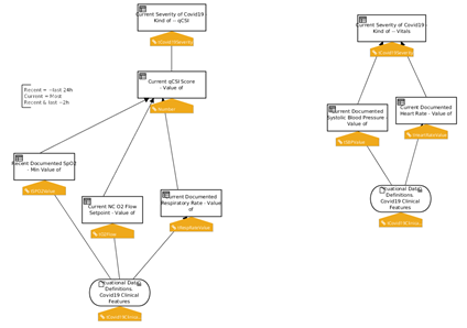 One of the earliest activities that the clinical knowledge engineer was to identify as many clinical concepts and potential data elements that may be used to express and/or infer those concepts for the scope of the entire guideline. The evidence (literature) was reviewed together with early summaries thereof, along with the initial draft of the severity classification and disposition guidance decisions. The concepts and respective data elements identified were fairly exhaustive and ultimately included a number of concepts not required for the logic of the COVID ED CPG “proper”. However, it was expected that while the vast majority of these concepts may represent elements of the evidence that might not ultimately inform the CPG logic for scoring and recommendations, they had potential to be of significant value in outcomes, health services, and clinical research and were of the nature to be collected as part of the feedback mechanism enabled by the “eCaseReport” (i.e. a clinical registry scoped to the CPG content).