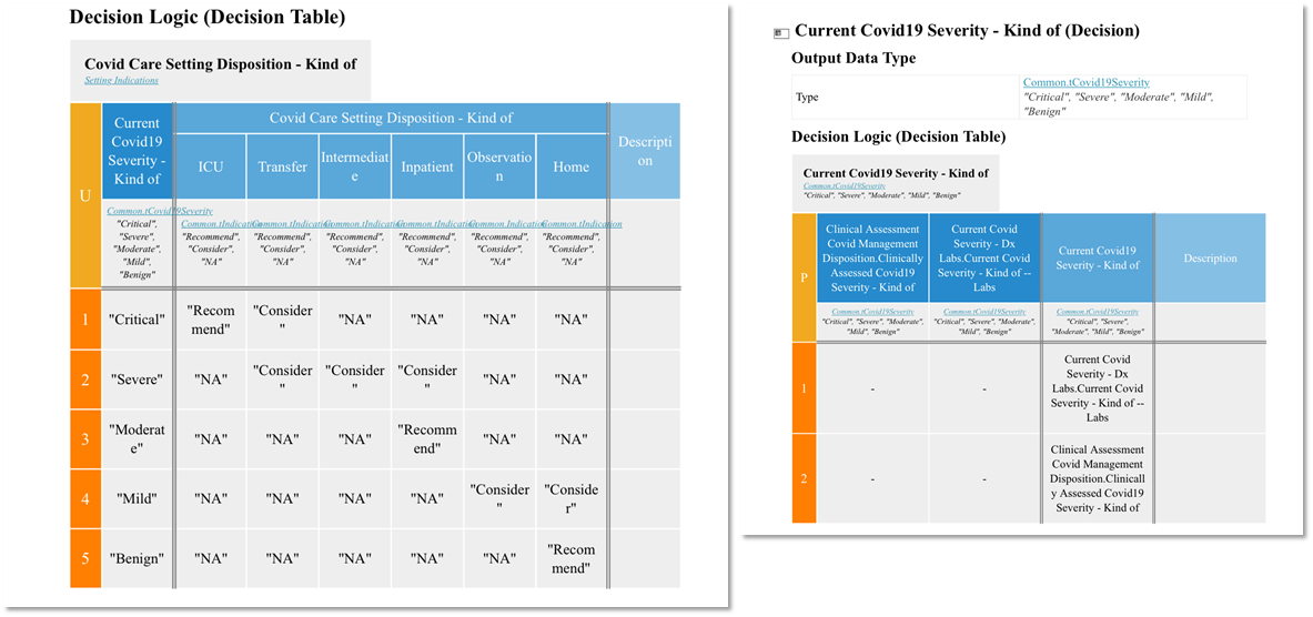 The clinical or SME knowledge engineers (SME KE) actively participated in many of the guideline development conversations and reviewed even the earliest drafts of the evidence reviews and initial iterations of the severity classification and recommendations. In an iterative and incremental fashion, SME KE elicited structured and more explicit information related to the severity classification and disposition recommendations, decision logic, and high-level implications for clinical workflow, the orchestration and decision logic for the strategies, and overall pathway and captured this knowledge in a structured template.