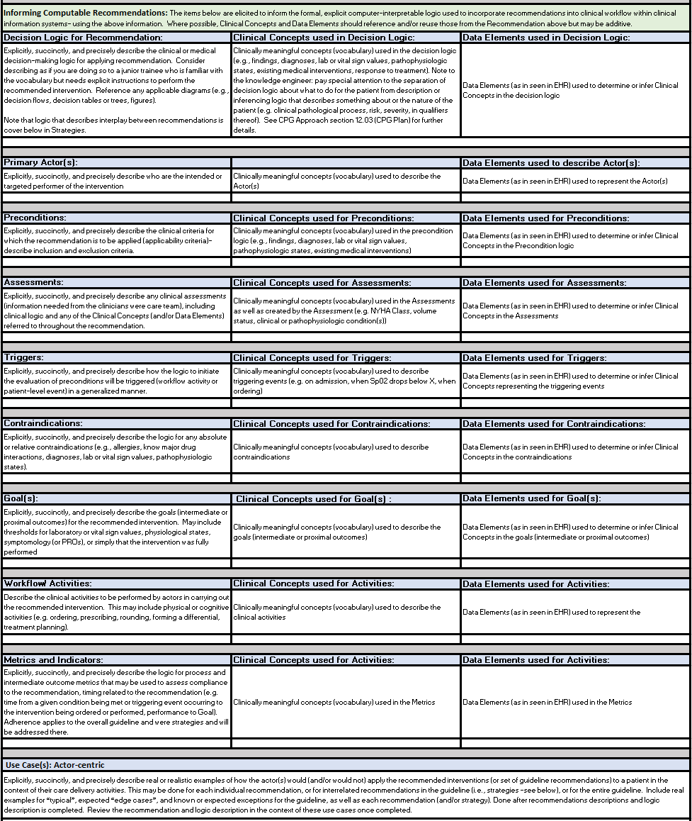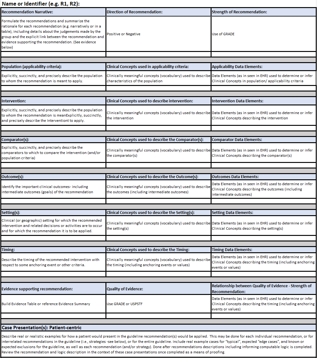 This template was based on tables and guidance provided by guideline development best practice resources (e.g. McMaster, NIH, CDC) with enhancements for knowledge elicitation and translation and is shared in the Tools and Checklist section of this implementation guide and the final work product can be found in the Examples section.