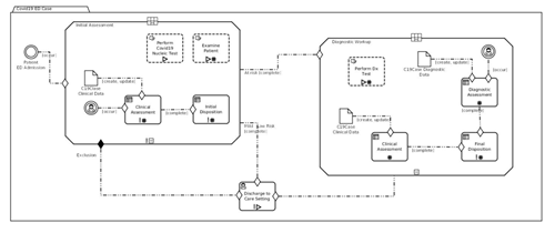 The language of choice for the representation of Care Process Models is OMG’s CMMN. CMMN is designed to handle “adaptive” Case Models, i.e. Cases whose course is determined by events whose sequence is not completely predictable at design time, and which require some strategic planning as the case unfolds.