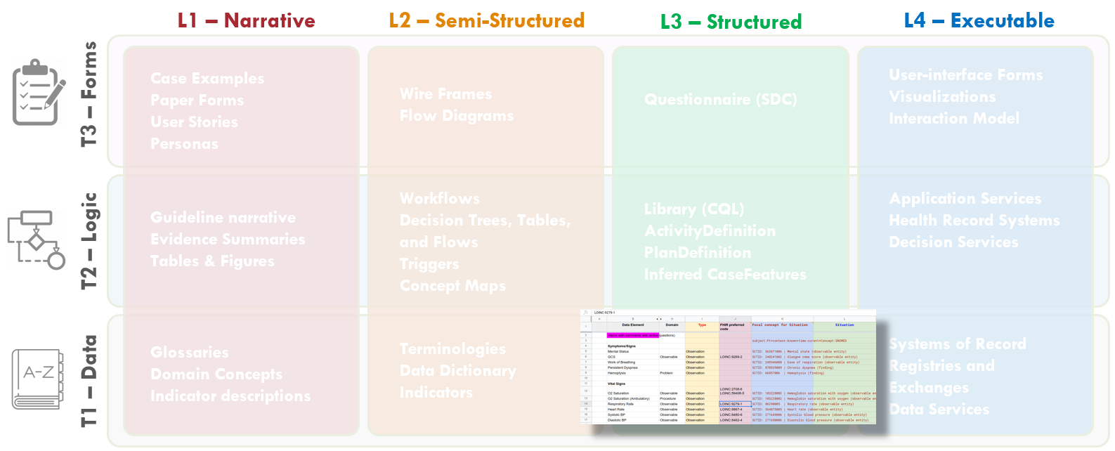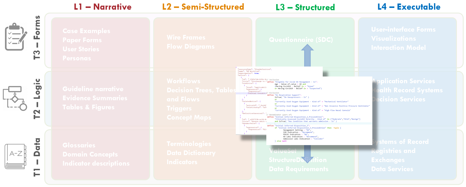 Fig. MSC.16. Together, the Structured Recommendation Template, the Decision Flow Diagram, and the Data Definitions for the COVID-19 ED Severity Classification and Disposition Recommendation guidance form the basis of shared understanding between Content SMEs (Clinicians and EMB scientists) and the Knowledge Engineering Team (SME and Technical KE’s, Terminologists). These artifacts cross-reference and reinforce one another as they span the Levels 1, 2, and 3 space and cross the Data, Logic, and Forms Tiers.