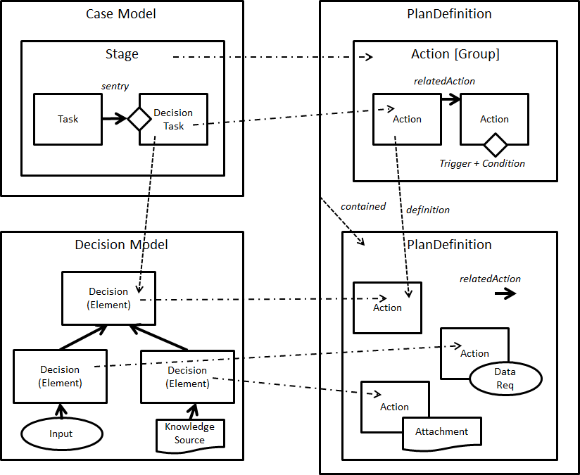 CMMN is compatible with DMN: (Decision) Tasks in CMMN can be linked to DMN Decisions, and the two languages can share data elements and data types – mostly by CMMN models reusing elements and types defined in DMN.