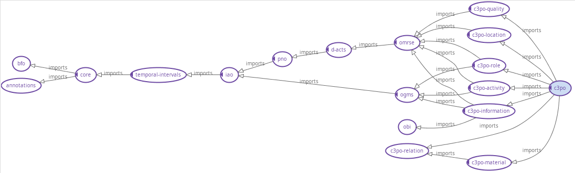 C3PO is an application ontology built on a framework of Basic Formal Ontology (BFO) and Ontology for General Medical Science (OGMS) along with modules from OMRSE & OBI . These provide the upper and domain level frameworks on which the following axis have been developed: